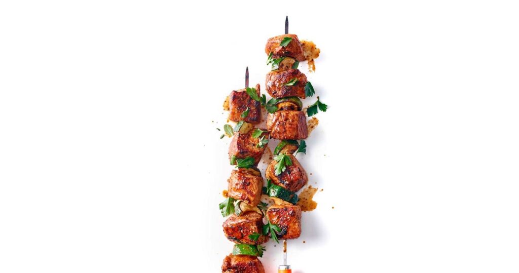 Cortar la bola en cubos y condimentar con sal, pimienta y orégano, en una sartén previamente caliente saltear los cubos de cerdo hasta dorar. En el palo para pincho incorporamos un cubo de cerdo y una lámina de zuccini hasta completarlo.