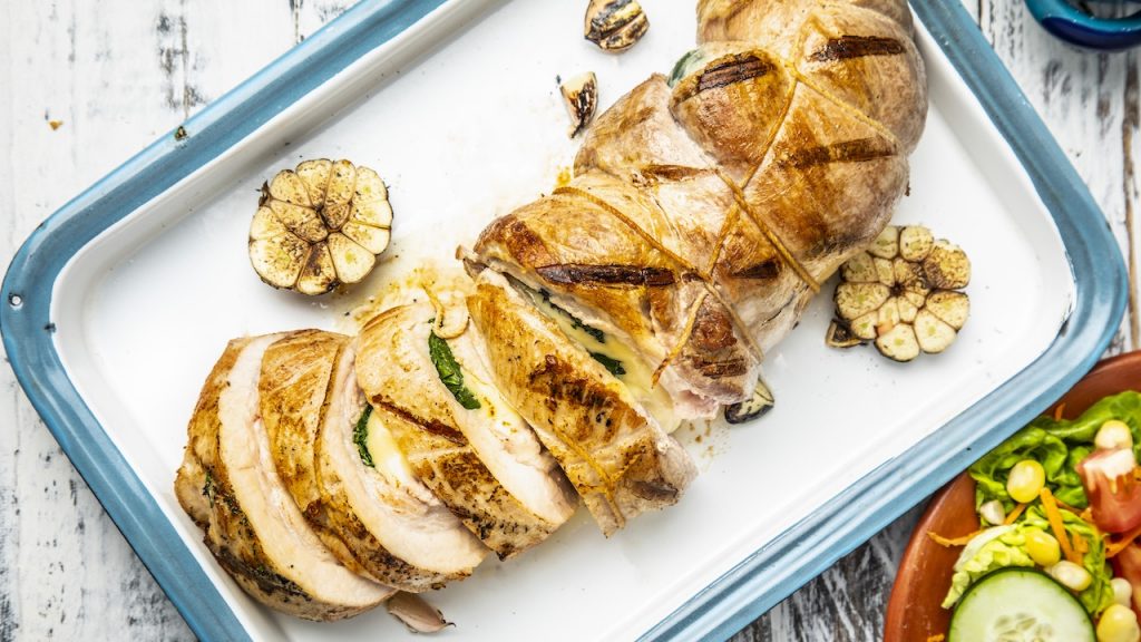 - Retirar el papel aluminio, cortar la sobre barriga de forma que el relleno se vea parejo, servir acompañado de una ensalada fresca de lechuga, tomate, zanahoria, pepino y mazorca desgranada