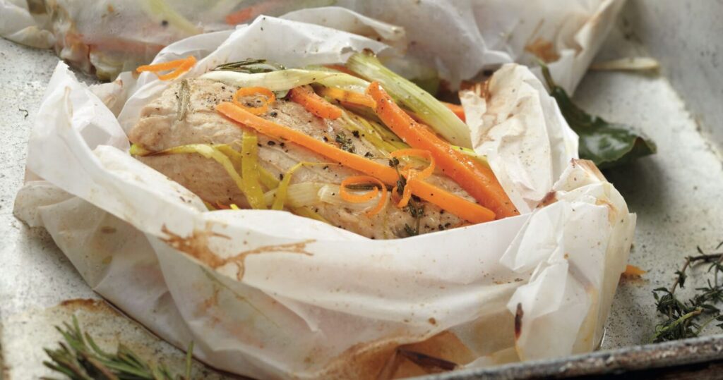 Corte dos cuadrados grandes de papel parafinado o papel aluminio. En uno de ellos haga una cama con los vegetales cortados y coloque una porción de solomito entero hasta que quede cubierto. Añádale tomillo, laurel y romero. Agregue un poco de aceite de oliva y zumo de naranja, sal y pimienta.