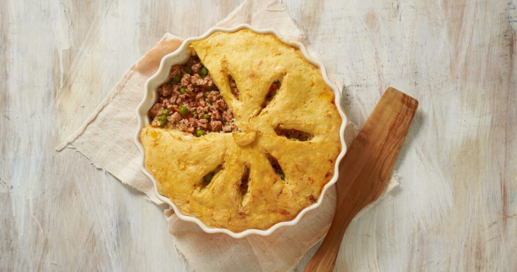 Engrasamos un molde de tarta u otro similar y colocamos una de las capas de masa extendemos bien por todas las paredes, luego agregamos el relleno de carne y cubrimos con la segunda capa de masa, sellamos los bordes con ambas capas de masa y hacemos unas incisiones con un cuchillo en el centro de la tarta en forma de cruz. Llevamos al horno a 160°C hasta dorar la masa.