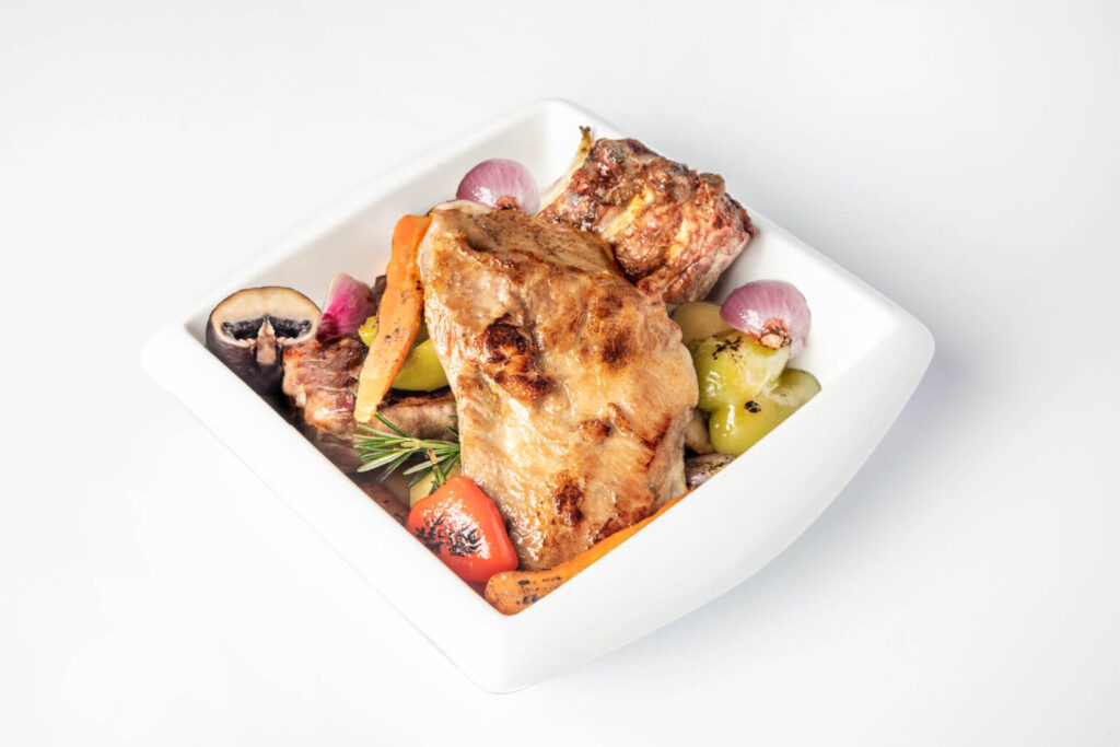 Servimos la tocineta con costilla acompañada de los vegetales asados.